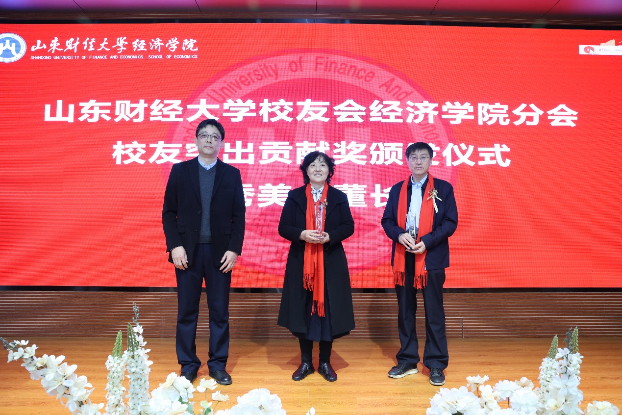 学院校友分会常�副会长、学院党委书记姜伟为学院老领导吕秀美、董长瑞颁发山东财大学经济学院校友突出贡献奖�