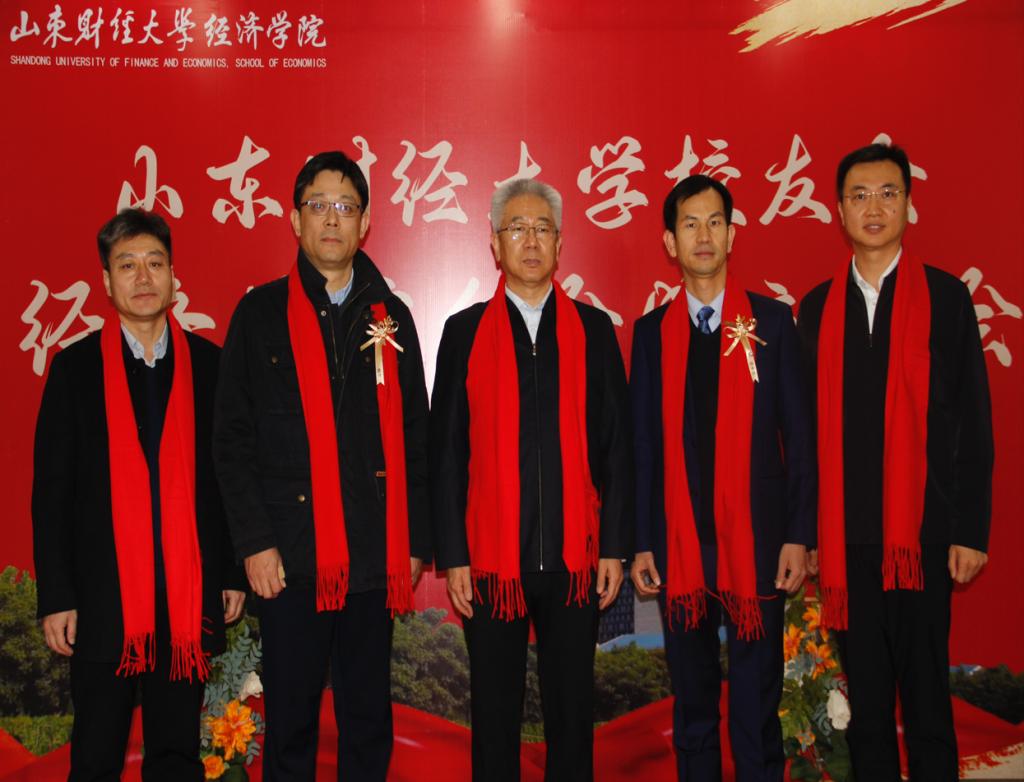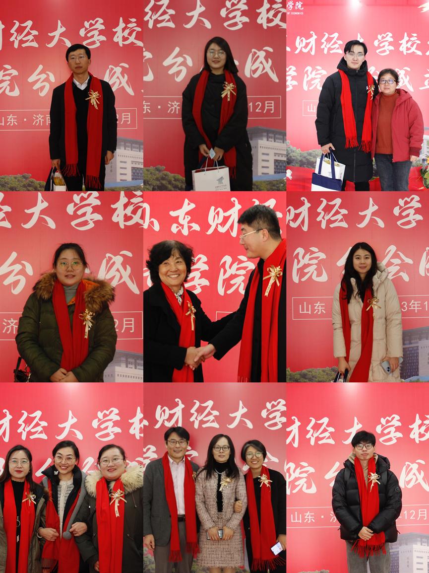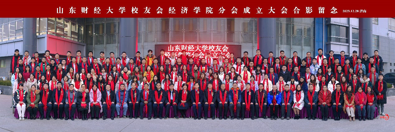 学校、学院领导老师与校友们系上�暖明艳的红围巾,在“山东财经大学校友会经济学院分会成立大会”展板前合影留念,共叙母校情谊�