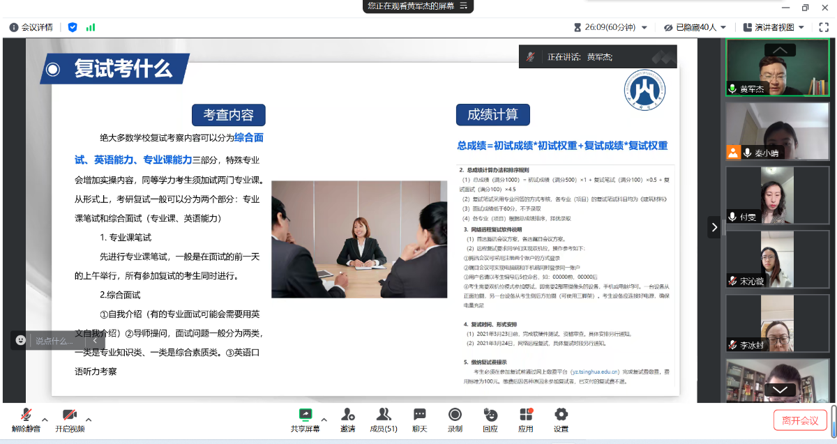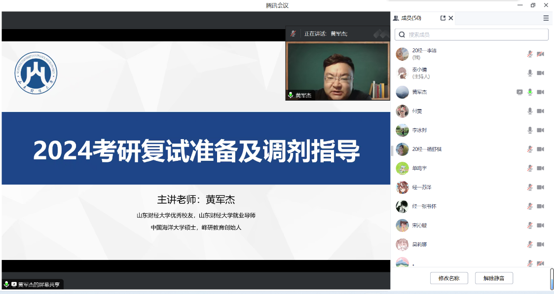 黄军杰是山东财经大学就业导师山东省教育发展委员会理事,有着十余年的考研规划指导经验。会议伊始,黄军杰对今年的考研难度和复试调剂形式进行了分析,主要围绕复试的重要性,复试的考察内容、复试前的准备及调剂的政策、调剂的注意事项、调剂平台、调剂具体操作等方面进行详细讲解;随后,针对考研调剂方面,黄军杰向同学们介绍了近几年来考研调剂详细情况,面对考研形势逐年愈发严峻以及就业难的背景下,他表示,同学们要根据成绩做出判断,在有限的时间内,通过校内校外信息渠道收集更多调剂信息,不要盲目二战,珍惜每一个升学机会;最后,黄军杰表示,欢迎同学们随时与他交流考研问题,一定会尽力为大家提供相关建议指引,帮助大家圆梦研究生�