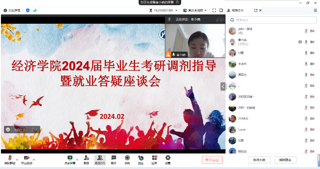 为进一步推�2024届毕业生就业工作,做好考研复试、调剂指导工作,2�21日上午,我院于线上召开2024届毕业生考研调剂指导暨就业答疑座谈会,此次座谈会面向大四毕业生,特邀山东财经大学校友、峰研教育创始人黄军杰为学生们作考研复试和调剂工作指导,院党委副书记李冰封出席会议,院团委书记付雯和辅导员秦小晴参加会议,并分别为毕业生讲解毕业前的注意事项以及就学生提出的就业相关问题答疑解惑,会议由秦小晴主持�