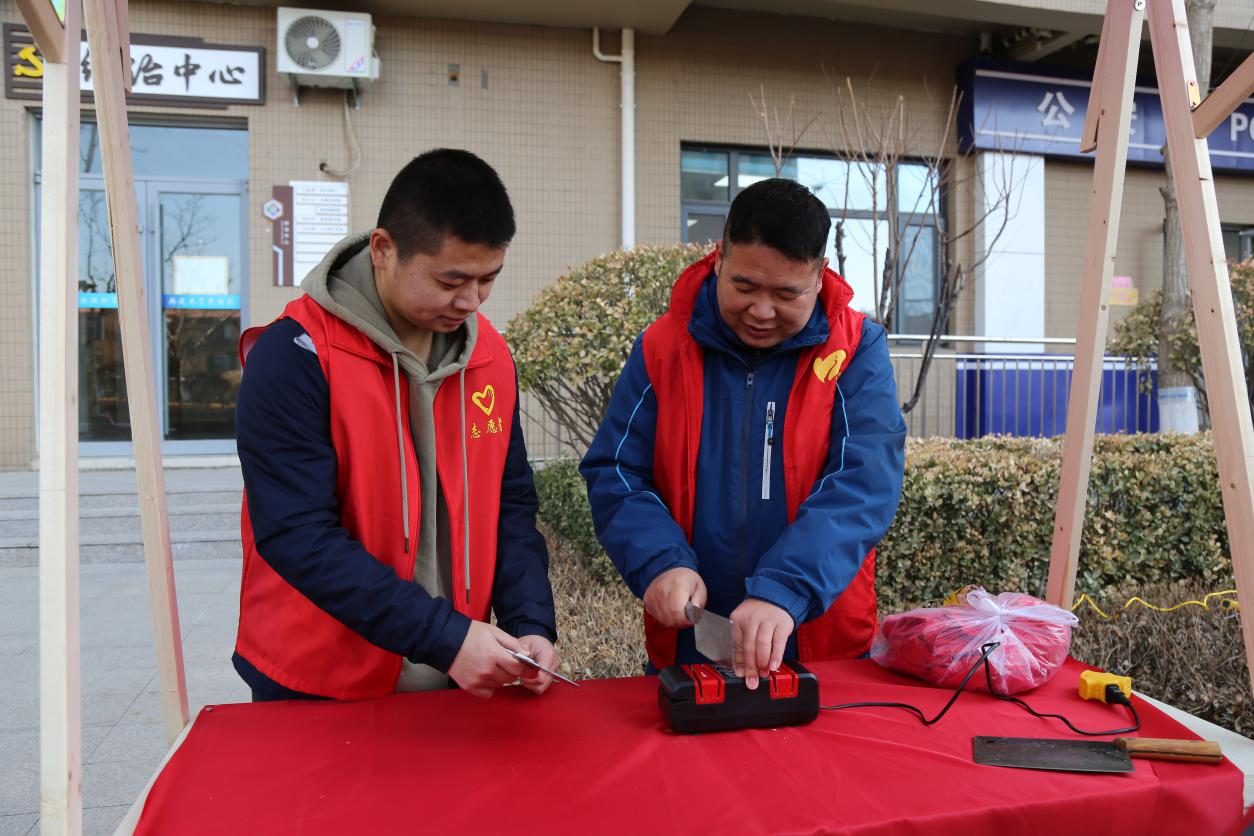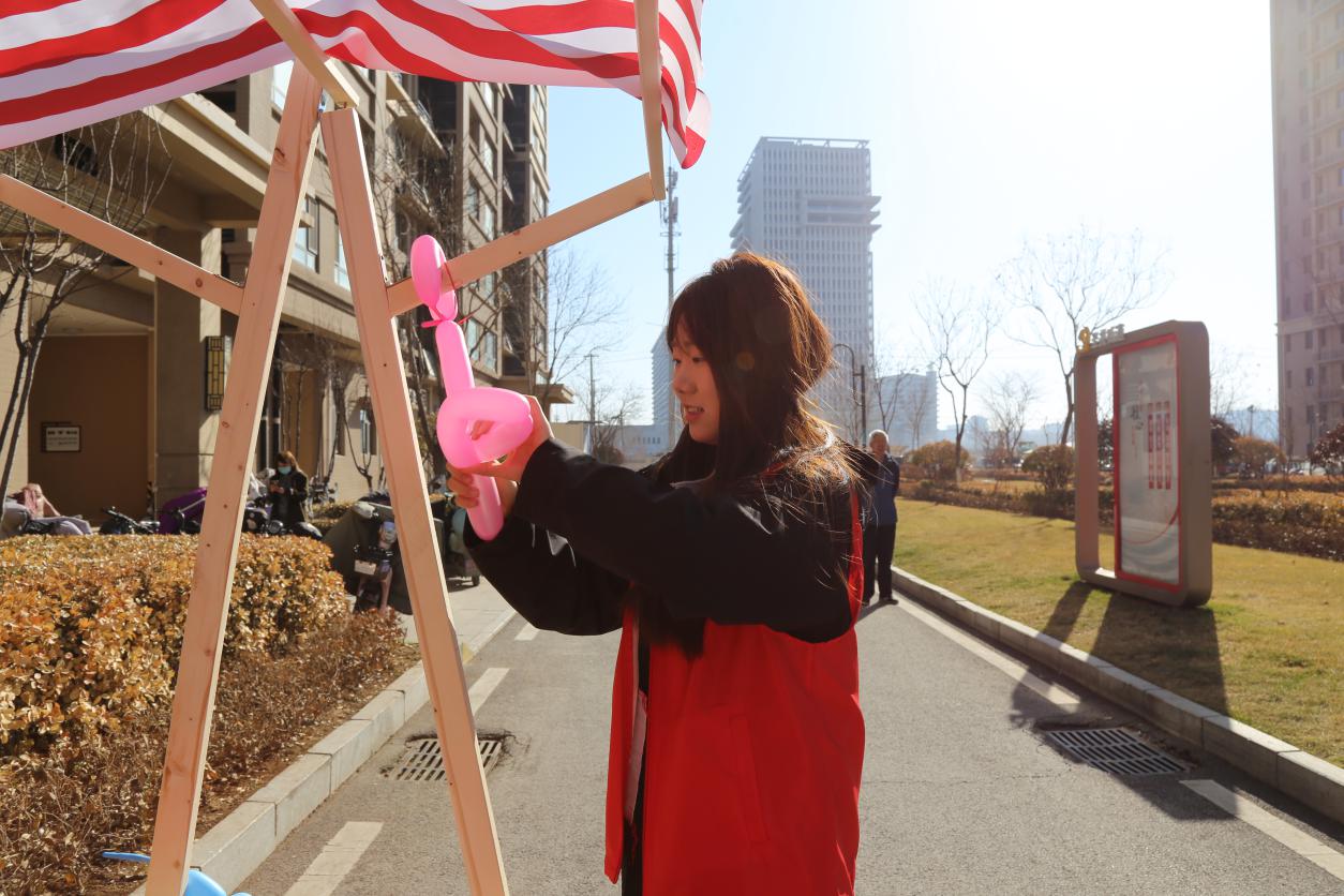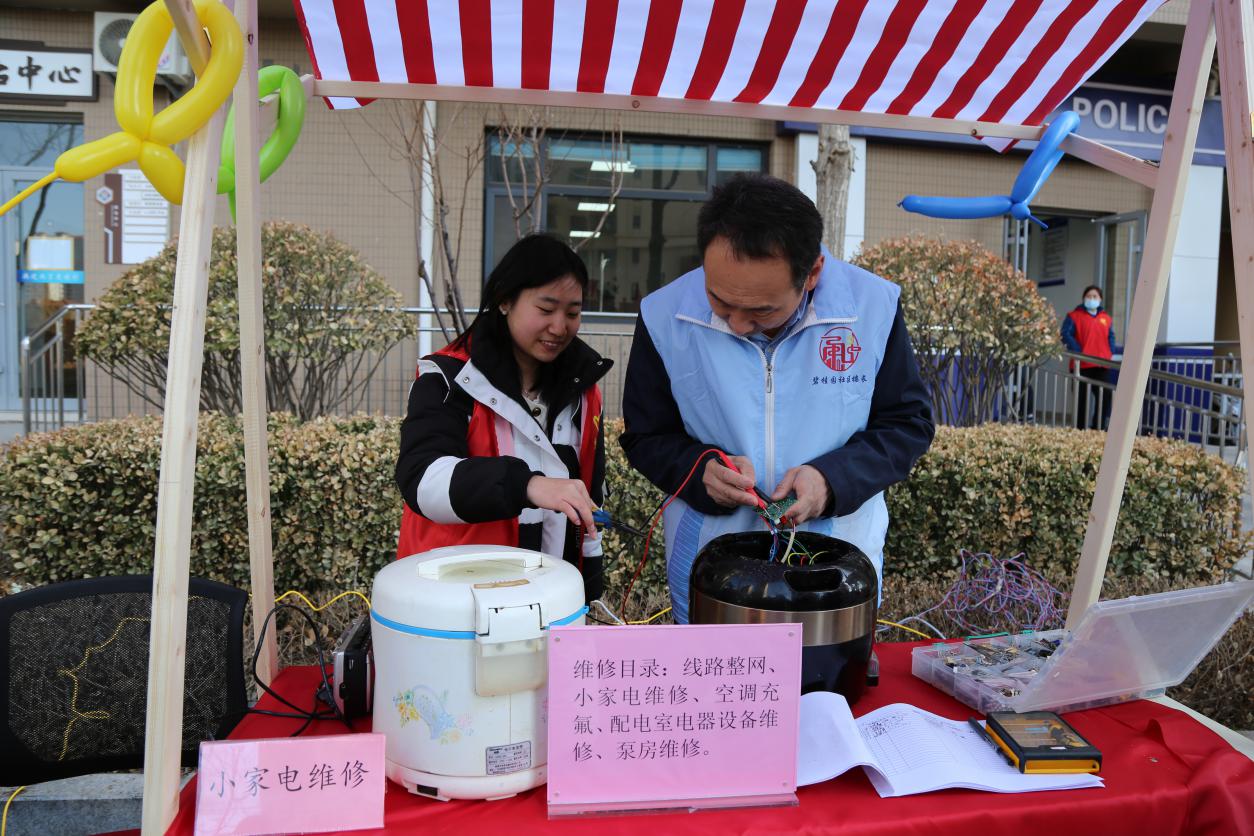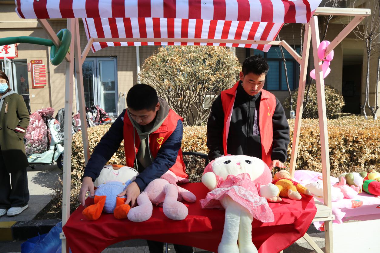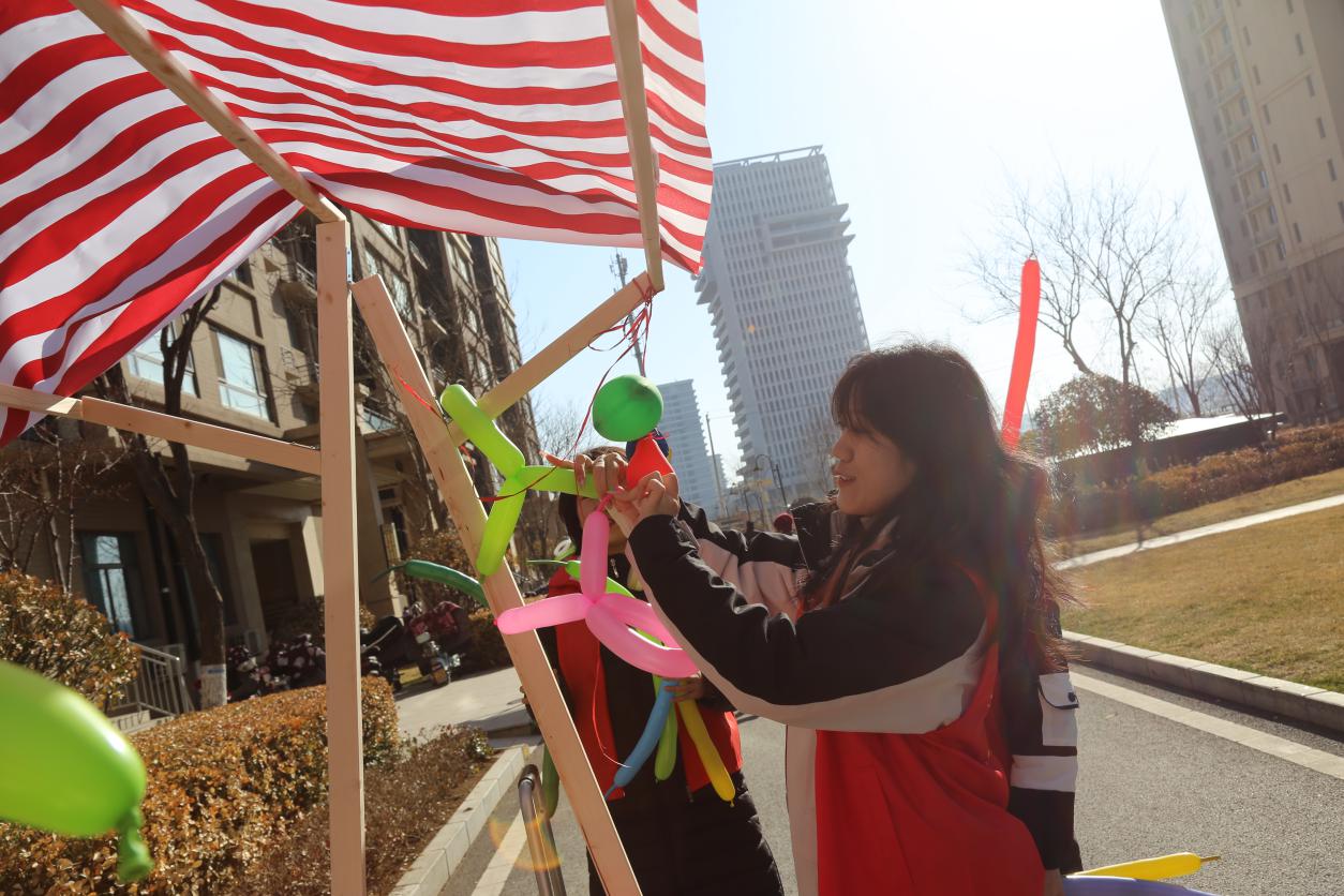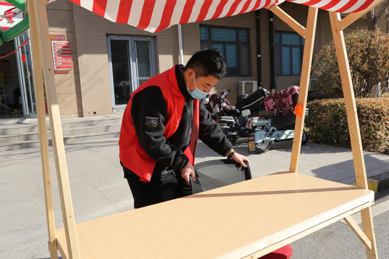 春风送暖,爱满三月。志愿者们早早地来到圣井碧桂园社区党群服务中心,帮助社区工作人员置公益市集摊位,拉横幅、吹气球、摆放桌椅、铺设装饰、搬抬工具。我院志愿在社区工作人员的指导下,完成磨菜刀、裁缝铺、中医问诊、爱心义剪、清洗地垫、家电维修、公益美甲、金融服务、鲜奶酸奶售卖、糖葫芦售卖、旧电动车回收换购、测量血压血糖等十余个摊位的布置工作�