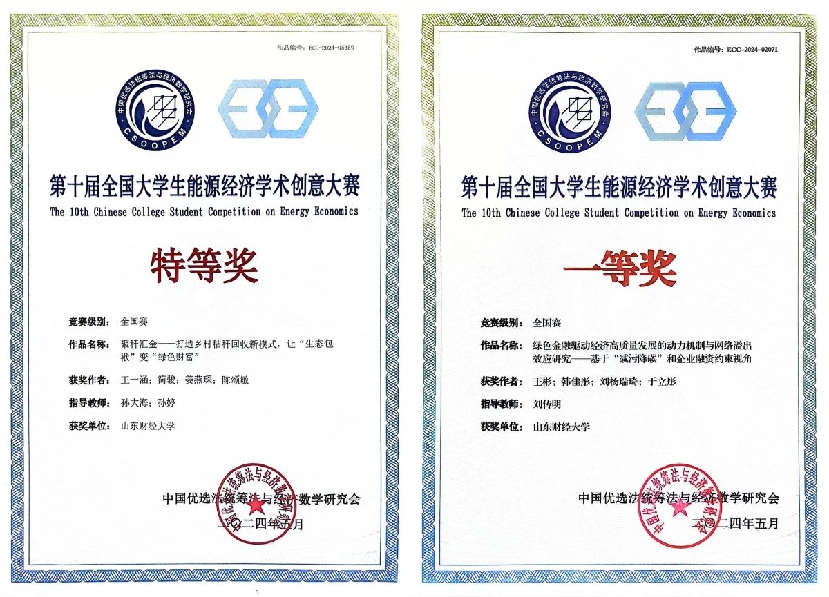 由公共管理学院教师孙大海和经济学院教师孙婷共同指导,经济学院2021级本�生王一涵为项目负责人的《聚秆汇金——打造乡村秸秆回收新模式,让“生态包袱”变“绿色财富”》团队获得特等奖。由经济学院教师刘传明指导,财政税务学院2021级本科生王彬为项目负责人的《绿色金融驱动经济高质量发展的动力机制与网络溢出效应研究——基于“减污降碳”和企业融资约束视角》团队获得一等奖�