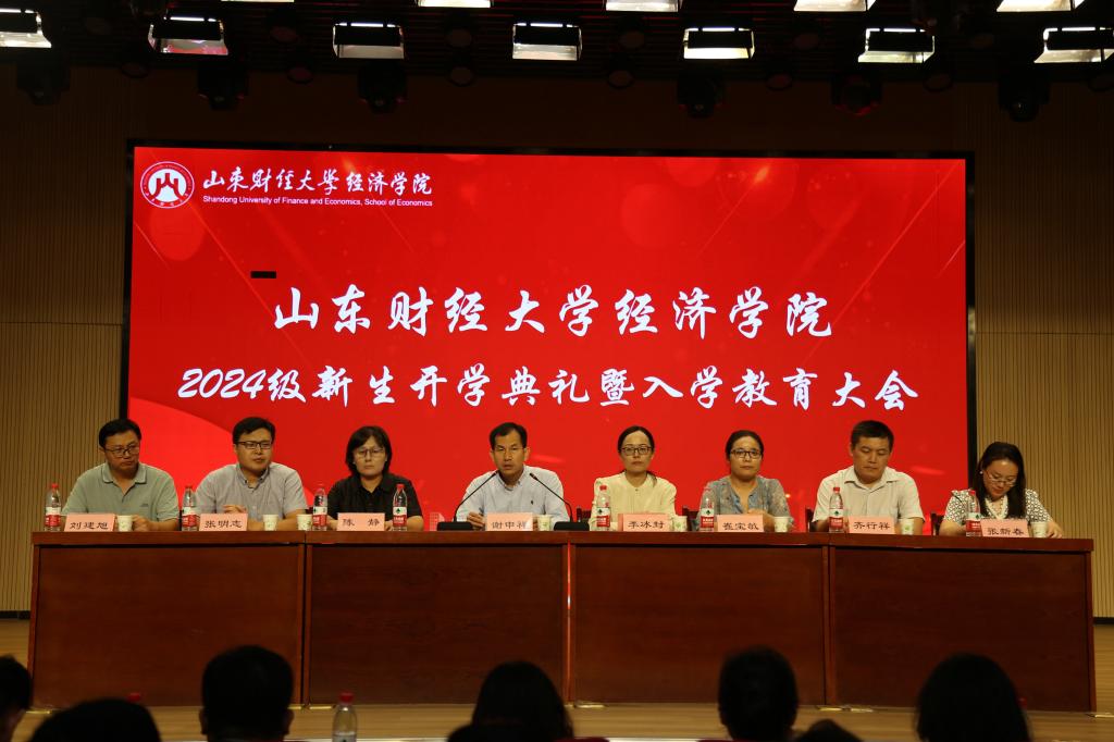 (通讯:王小� 董欣怡)9�9日晚�经济学院2024级本科新生开学典礼暨入学教育大会在圣井校区文化活动中心一楼报告厅举行。山东财经大学党委副书记、经济学院院长谢申祥,经济学院党委副书记李冰封、陈静,副院长崔宝敏、张明志,院长助理齐行祥、刘建旭,教师代表张新春出席会议,会议由李冰封主持�