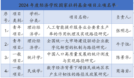 近日,全国哲学社会科学工作办公室公布�2024年国家社科基金年度和青年项目立项名单,济学院获�4项。其中,一般项�2项,青年项目2项,立项总数占全�18%,立项数位居全校教学科研单位�1。从立项学科来看,理论经济学2项,统计�1项,民族�1项,其中民族学项目是我校首次获批,实现新突破�