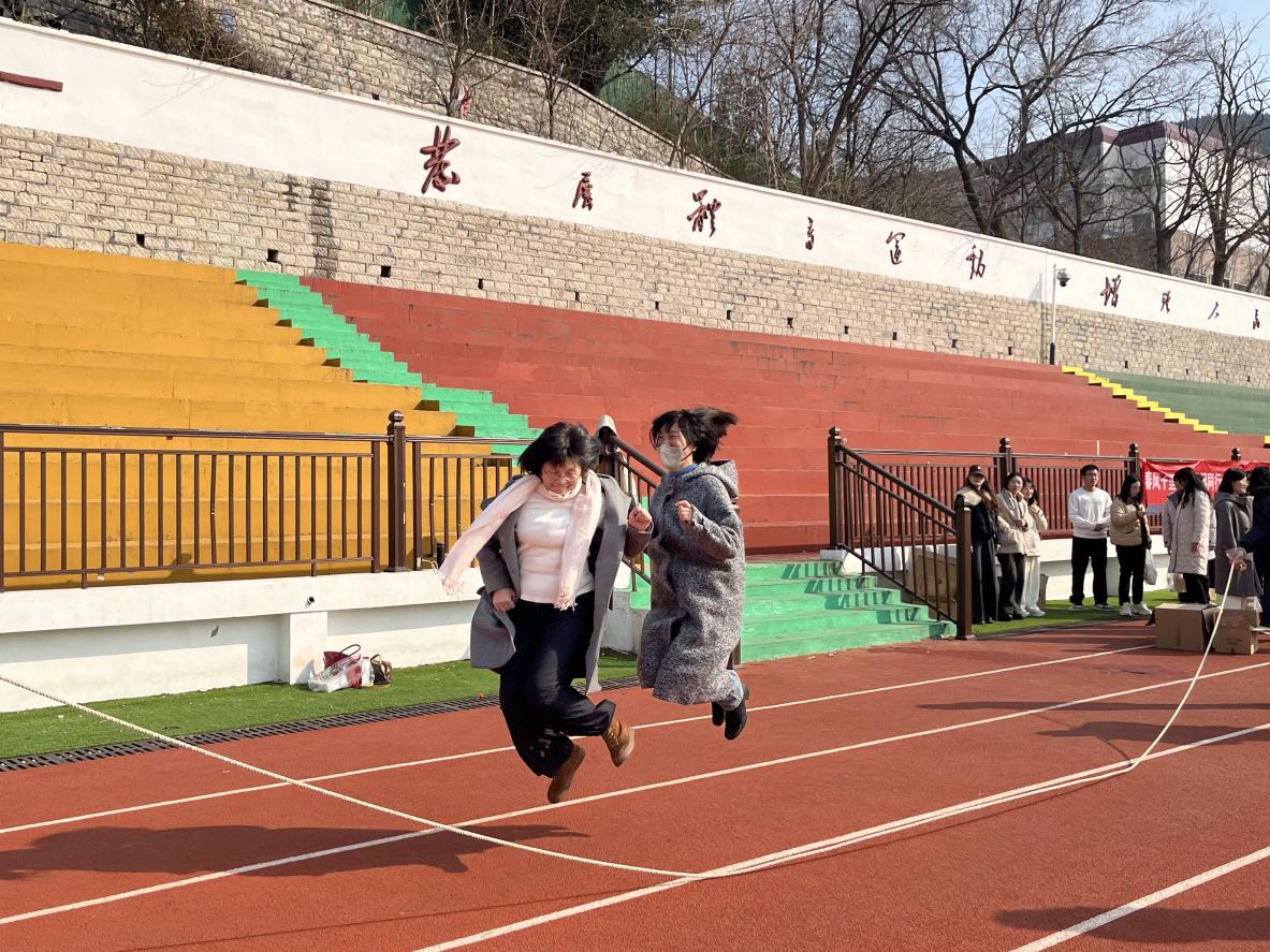 在灿烂的阳光下,教师们手持绳,个个精神抖擞,蓄势待发。他们的脚步灵活敏捷,脚尖轻点地面后又迅速弹起,助跑、入绳、腾跃、闪撤,每一个动作都一气呵成,毫无拖沓。大家默契十足地配合着,尽情释放着内心的活力�