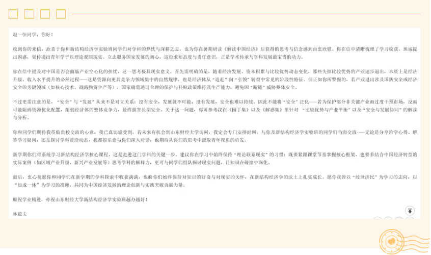 赵一恒在信中谈到,《解读中国经济》让他对中国经济发展逻辑有了更清晰的认知,也更加坚定了“以所学服务国家经济发展”的决心。同时,他结合美国因产业空心化引发贸易逆差扩大、底层民生难等后果,以及国内部分地区劳动力成本上升、产业外流的现象,询问“中国未来是否会面临类似产业空心化风险”。信的最后,他代表班级全体同学表达了深耕新结构经济学�信念,并期盼林毅夫教授能够莅临学校进行指导交流�
