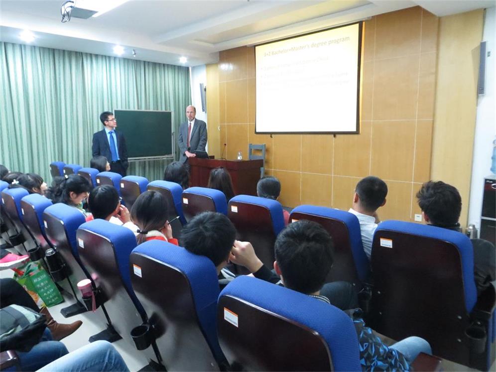 Mark Severson教授首先向大家详细介�纽约州立大学布法罗州立大学的专业、学位设置,发展状况,本科生和研究生培养的课程体系、模式与特色,以及布法罗州立的地理位置和校园风光,并全面细致讲解与我院合作的�3+2�留学项目相事宜。随后,他重点介了经济和金融部门、应用经济学的硕士项�,课程设置及师生培养方式�
