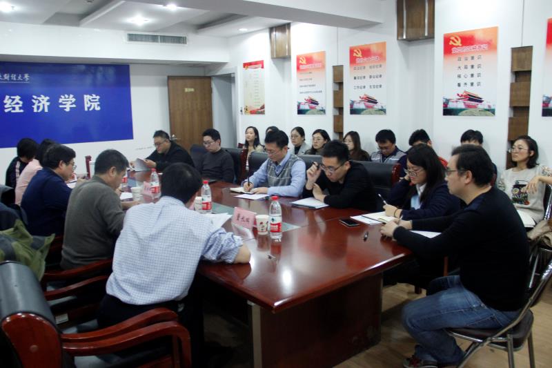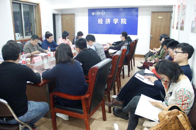 11�21日,“经济学WORKSHOP”第七期在舜耕校区经济学院会议室举行�本期主题是国家“两金”项目申报选题论证。学院特邀上海财经大学城市与区域科学学院刘乃全教授、济南大学商学院葛金田教授、山东师范大学经济学院乔翠霞教授作为点评人,学院院长董长瑞以及拟申报2020年度国家“两金”项目的老师到会。副院长王传荣主持了本期工作坊�