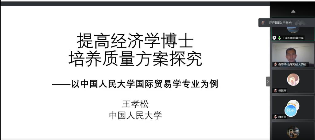 王孝松教授基于中国人民大学国际贸易学专业,就如何提高经济学博士培养质量方案进行了讲解。王教授分别从培养方式、主要培养环节的学习进度要求�中期考核、选拔与退出机制等方面的近期改革做了阐述,并对数理方法和软件,理论学习和论文写作脱节,前沿性和系统性等方面存在的不足进行了深入思考与分析,为提升博士培养质量提供了良好的借鉴�