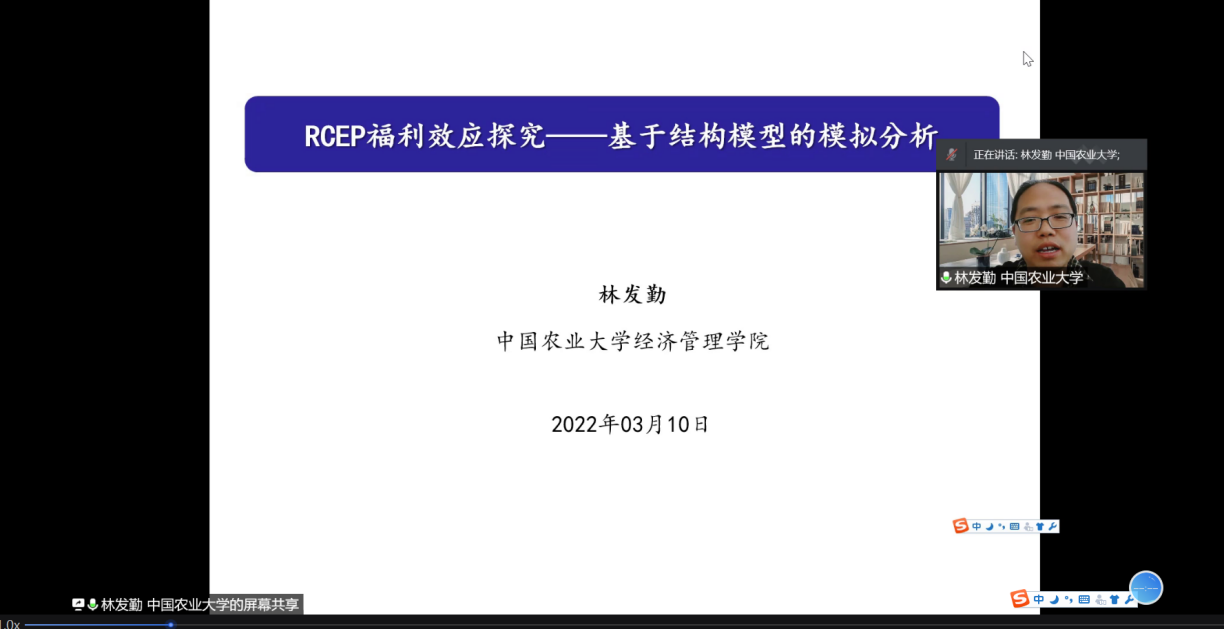 本次报告主题是“RCEP的福利效�-基于结构模型的测算”。围绕这一主题,林发勤教授从引言、理论模型、数据和模拟策略及估计结果四个方面由浅入深阐述了RCEP引致的关税削减代表的贸易成本与福利之间的相关关系�