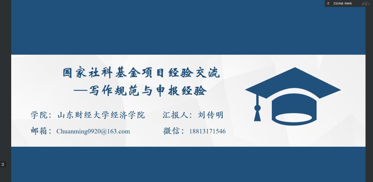 刘传明老师的报告主题为《国家社科基金项目经验交流——写作规范与申报经验》。围绕这一主题,刘老师认为项目申请书的形式与内容同等重要,整洁美观的申请书会给评审专家留下美好的第一印象,是迈出成功的第一步。刘老师首先提出选题要满足国家重大战略需求,把握术前沿,对拟题的方法提出了建议。随后刘老师对选题的依据、学术史梳理、学术价值与应用价值、研究提纲、技术路线、研究重点难点等方面分别从形式和内容上进行了详细的讲解,并具体在版面比例、内容结构、字体行距、配图设计等方面提出了中肯的个人建议�