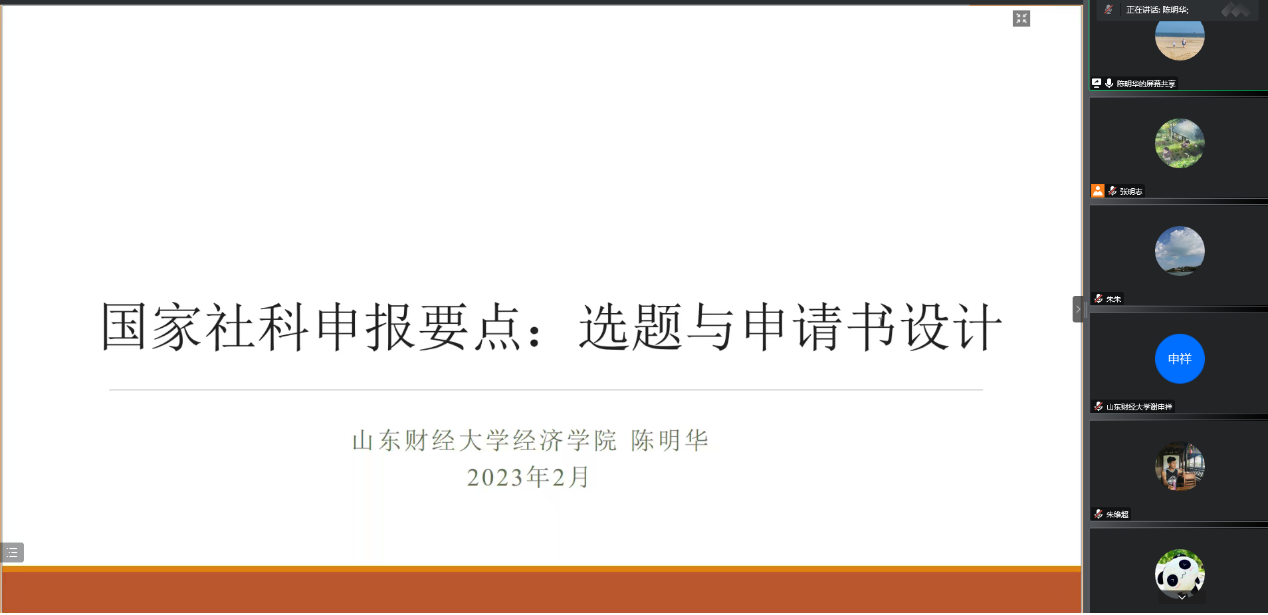 为进一步做�2023年度国家社会科学基金项目申报工作,提升我院教师项目申报质量,我院通过线上腾讯会议形式�2023�2�7日和2�8日顺利举行了两场国家社科金项目申报经验享系列讲座。本次讲座主讲嘉宾为具有主持国社科基金项目经验的陈明华教授和刘传明老师。谢申祥副校长参加了本次讲座,会议由张明志副院长主持,我院部分教师参加了本次会议�