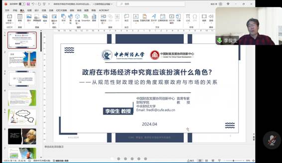 本次报告的主题是“政府在市场经济中究竟应该扮演什么角色?——从规范性财政理论的角度观察政府与市场的关系”。报告分析了为什么必须研究政府在市场经济中的角色问题,政府是否正在改变其在市场中的角色,如何理解政府在市场中的主体地位,以及政府在市场中的双重角色与两种指标。研究得出四个结论:一是政府决策与服务的技术基础在变化,二是市场主体(政府与非政府)之间的关系在变化,三是国家范围内政府之间的关系在变化,四是公民的社会地位在变化。李俊生教授还就国家——国家权力机构——政府的涵义进行延申讨论�