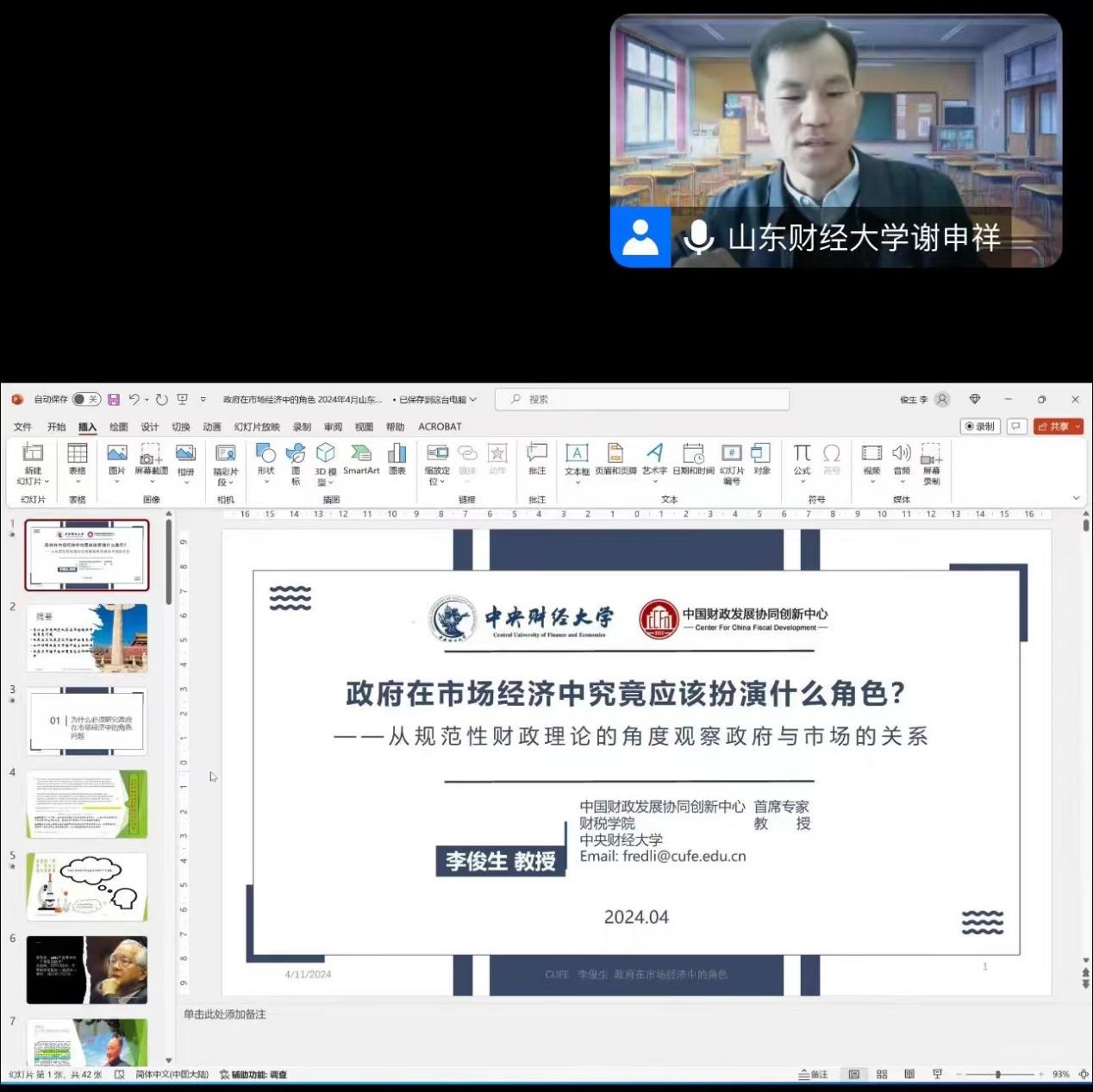 2024�4�11日上午,由我院联合财政税务学陀学科建设办公室主办的明德经济讲�在线上腾讯会议顺利举行。本场邀请到的主讲嘉宾是中央财经大学李俊生教授。报告由山东财经大学副校长谢申祥主持,经济学院和财政税务学院部分师生与讲座�