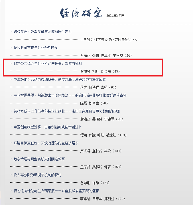 近日,我院谢申祥教授(第一作者)的合作论文:《地方公共债务�企业不动产投资:效应与机制》在国内经济学顶级期《经济研究�2024年第4期发表,该刊系我校特类期刊�
