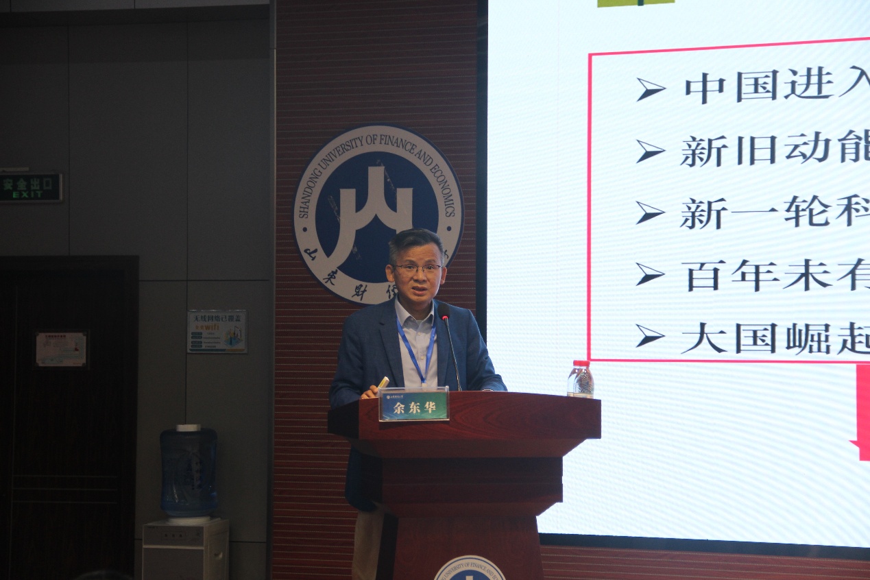 主旨论坛下半场由山东财经大学经济学院副院长张明志教授主持。山东大学黄河国家战略研究院执行院长余东华教授作了题为“以新质生产力促山东经济绿色低碳转型”的主旨演讲,总结出了科技创新、产业升级、要素配置、市场组织、生产关系五大新质生产力赋能山东绿色低碳高质量的作用机制�