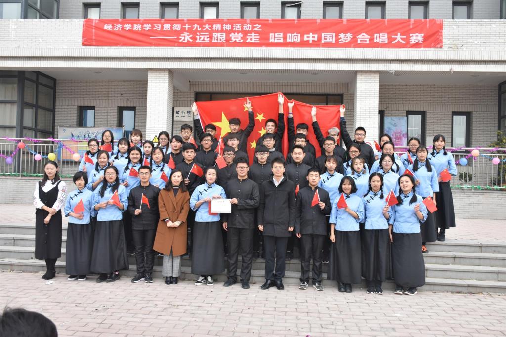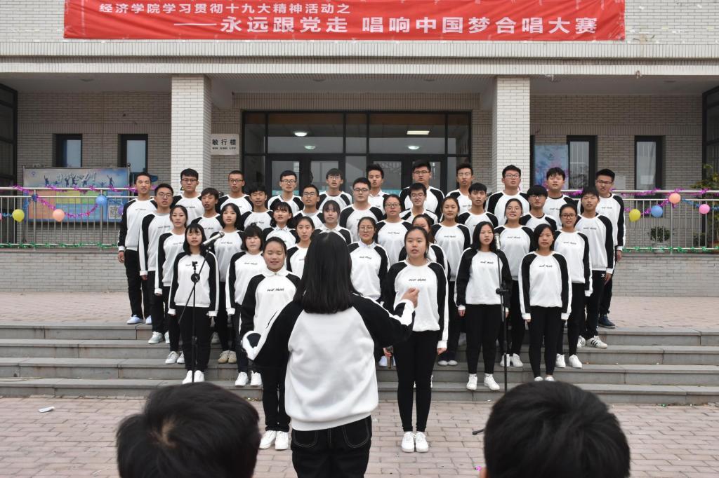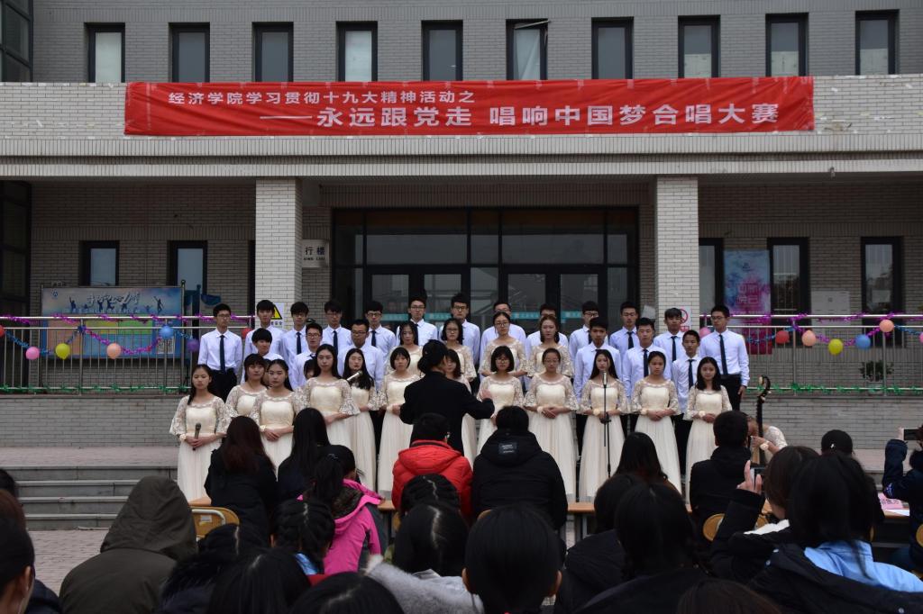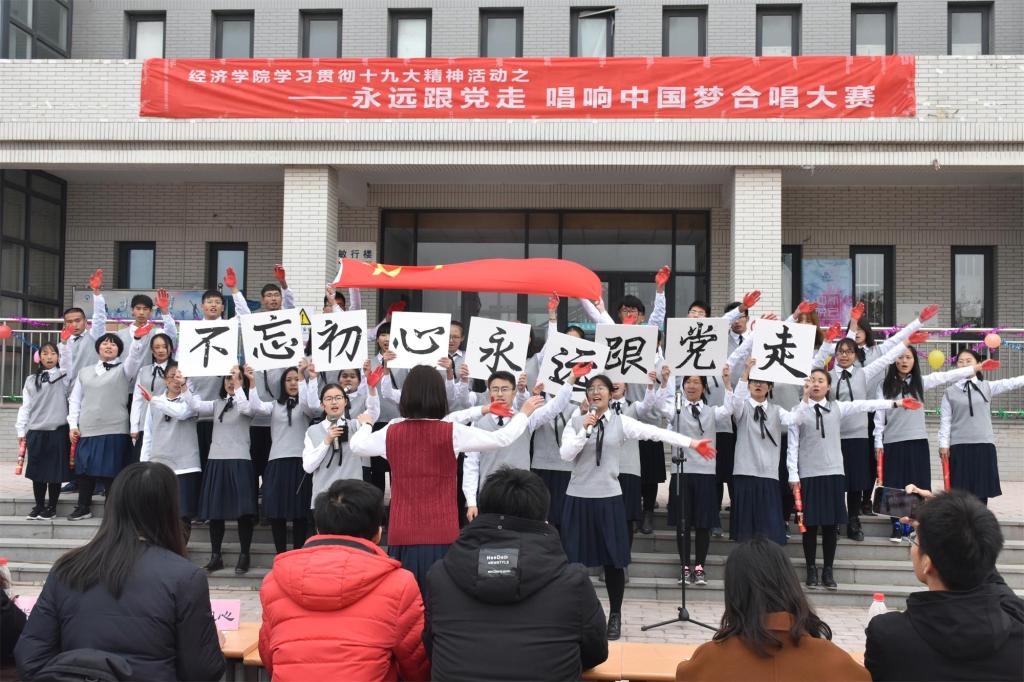 (通讯员:白战� 杨晓雯)为深入学习贯彻十九大精神,激发同学们爱党爱国情怀,展现经济学院学子良好精神风貌和艺术素养,营造格调高雅、健康向上的校园文化氛围�11�16日下�14�00,经济学院于圣井校区敏行楼前举办“永远跟党走,唱响中国梦”合唱大赛。此活动系我院学习贯彻十九大精神系列活动之一。经济学院辅�员付雯、朱海林老师出席�2017级全体学生到场参加�