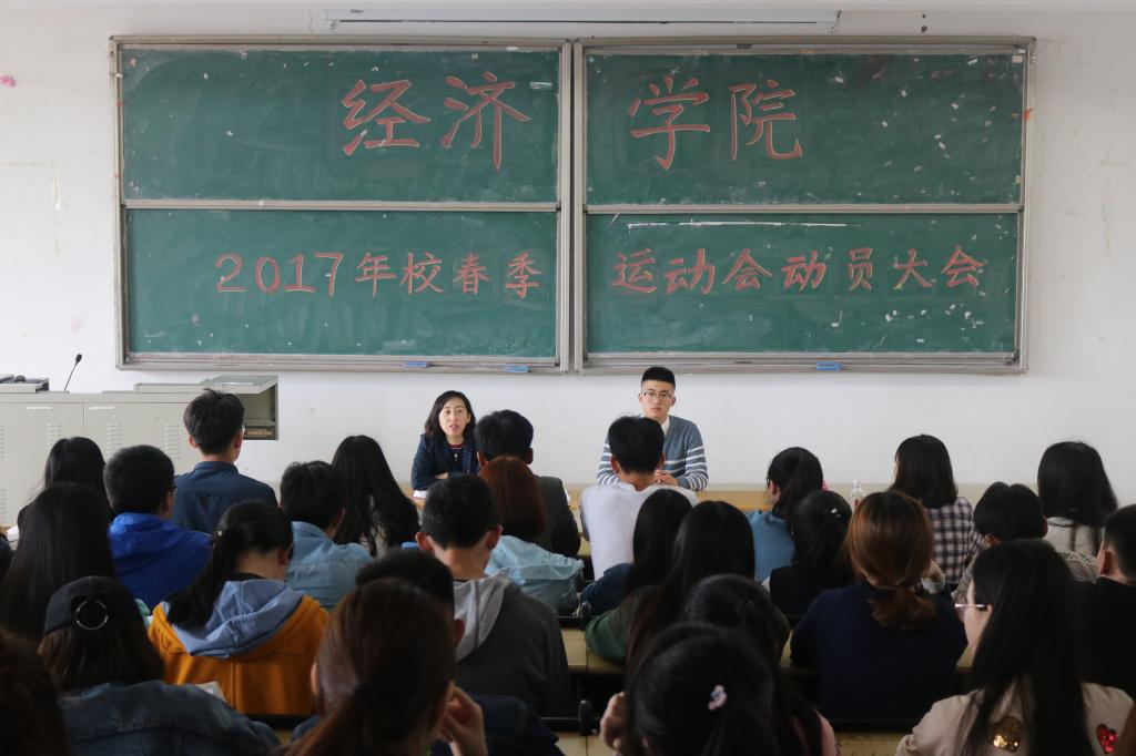 (通讯员:刘晓彤田永佳�4�20日中�12:30,经济学院于圣井校区敏行�B5-301教室召开2017年校春季运动会动员大会。经济学院团委辅导员付雯、学生会主常建出席会议,全体运动员、啦啦操队员、方阵队员、工作人员参加会议�