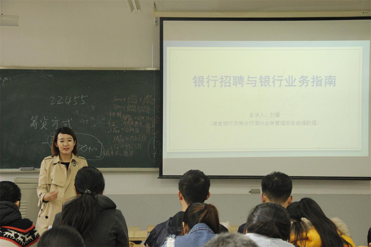(通讯员:郭雯瑶)11�11日下�2�00,经济学院于舜耕校�1303教室举办“银行招聘与银行业务指南”讲座,浦发银行济南分行滨州业务管理部总经理助理刘蕾主讲,我院13�14级部分学生到场参加,讲座由院党委�书记任海伦主持�
