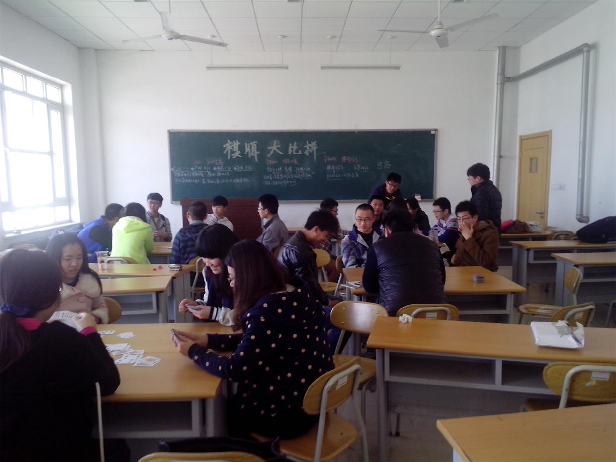 3�15日下�2:00,经济学院在圣井校区敏行�B5401�B5402�B5403教室举办了“以棋会友”棋牌类综合竞赛。经济学院圣井校�2012级�2013级各班选手参加比赛�