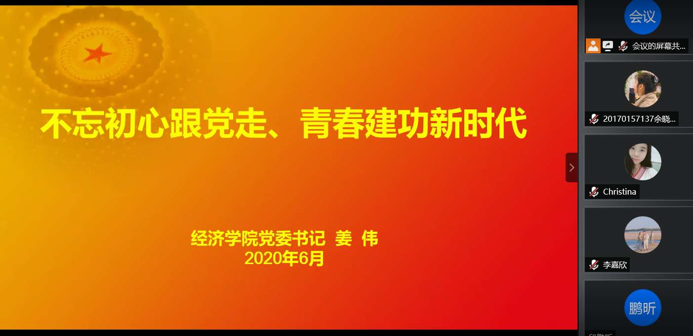 2020�6�24日下午,经济学院党委书记姜伟以“不忘初心跟党走,青春建功新时代”作主题为学生第五党支部上了一堂深刻的党课。会议由党支部书记李冰封主持,学生�五党支�28名党员参加�
