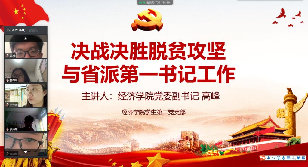 2020�6�28日下午,经济学院党委副书记高峰为经济学院学生第二党支部上了一堂主题为“决�决胜脱贫攻坚与省派第一书记工作”的党课,学生第二党支部全体党员聆听了此次党课,党课由学生第二党支部书记裴斐主持�