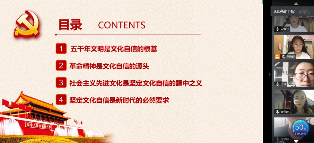 齐杨从文化的概念开始,通过中华五千年文明、革命精神、社会主义先进文化和新时代的必然要求等四个方面全面而深刻的阐释了中国抗“疫”精神中体现的文化自信。新冠肺炎疫情爆发后,全国人民团结一心及搬家式驰援体现出了中华民族“同舟共济、守望相助”的传统文化精神;医护人员告别亲友,义无反顾,硬核式支援彰显出了中国共产党“勇于担当、甘于奉献”的革命文化精神。中国共产党和中国人民在抗疫中坚持的“党的领导、人民至上、守正创新”,正是社会主义先进文化的核心。中国人民在抗“疫”中彰显的无畏精神,不�传承了传统文化的道德精神,也融合了革命文化的精神内涵,已成为新的中国精神。随后她通过中国在全球抗“疫”中的一系列行动,阐明了我国政府在抗疫中的大国力量和大国担当,也进一步体现了文化自信的丰富意蕴。随后,齐杨结合学校、学院积极响应落实疫情防控工作的情况,列举了在疫情期间线上教学活动、新建在线资料库等情况,说明师生一起积极创新,借助线上新媒体优势,保障课程稳定进行。这也充分证明了大疫当前中华民族强大文化自信的精神伟力。最后,齐杨号召我们谨记习总书记的指示“实现中国梦必须弘扬中国精神”, 将个人理想信念与家国使命紧密结合,学生党员更要树立坚定的文化自信,在中华民族伟大复兴的进程中实现青春价值�