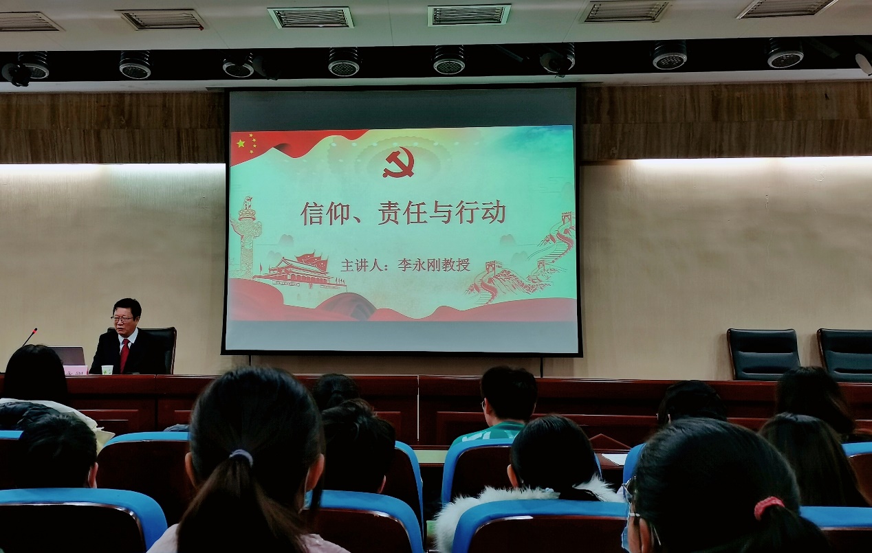 李永刚教授以“信仰、责任与行动”为主题,并分别进行详细的阐述。首先,李永刚讲解了信仰的概念和特征,帮助入党积极分子清楚认识信仰与观念、信念、迷信的区别,并�合古今中外的名人事迹,歌颂伟大人物坚守信仰、无私奉献的精神,激励同学们确立正确的奋斗目标,积极践行社会主义核心价值观,以信仰作为行动准则和人生指南来约束自己。随后,李永刚从内涵、价值和练就三个方面讲述了责任的相关内容,让同学们更加深刻的感受到责任是让人坚强勇敢、塑造核心竞争力、获得信任并�实现自身价值的一种执着和信念,鼓励大家培养遵守规范、承担责任和履行义务的自觉态度,树立正确的责任意识,努力成为追逐梦想、学会感恩、关注细节、不断行动,勇于承担的中共党员。最后,李永刚现身说法,生动形象地解释了“五动说”和“行动的三二一模式”,教育学生要踏实肯干,将理论与实际结合,用实际行动实现伟大梦想�