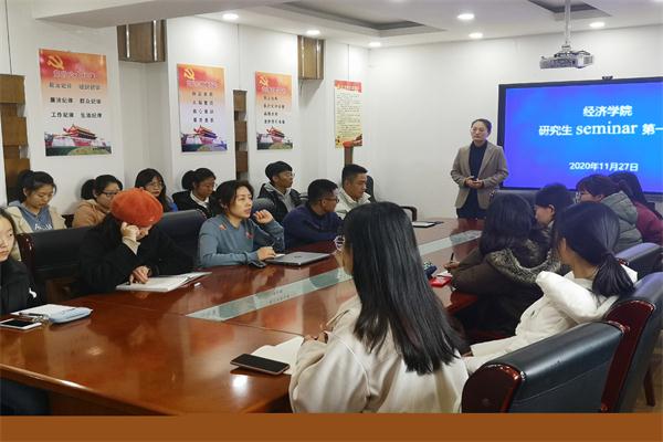 2020�11�27日下午,经济学院研究生SEMINAR第一期在舜耕校区办公楼1208会议室顺利举行。山东财经大学经济学院教师尹秀�士担任主讲人,研讨会经济学院副院长彭留英教授主持,经济学院2020级理论经济学硕士研究生参加研讨会�