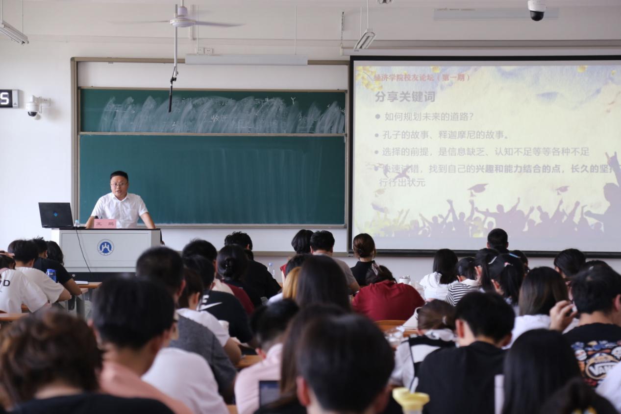 (通讯员:付雯 公天� 孙婷潇)为搭建学院与校友、校友与校友之间交流平台,凝聚和发挥校友力量,加强学生专业思想教育,引导学生明确学业、职业发展方向,6�15日下午,经济学院在圣井校区七号教学楼举办“共话发� 携手未来”经学院校友论坛第一期,本次论坛由经济学�2002级经济学专业校友、山东弘裕事务所集团总经理王鹏主讲,经济学院20�21�22级共150余名学生到场参加。本次论坛由院团委书记付雯主持�