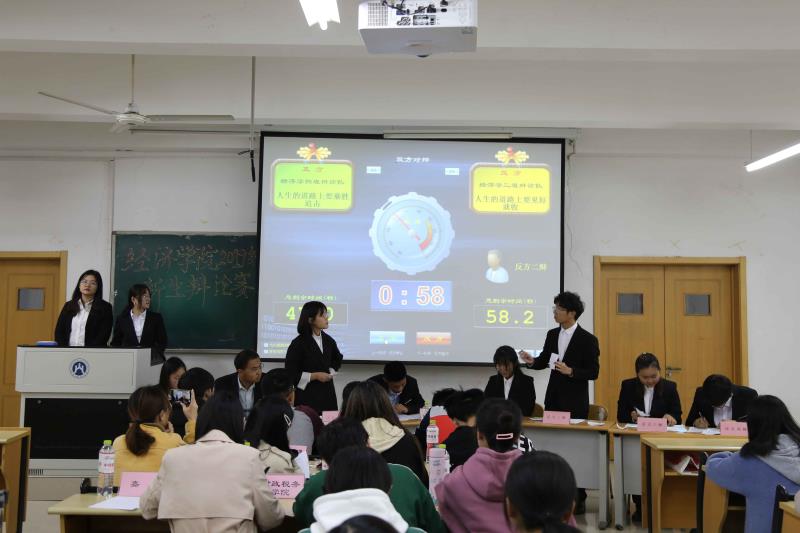 (通讯员:许佳璇)为营造勤于思考、善于思辨的学术文化氛围,激发我院学子探索真理、追求真知,提高语言表达和逻辑思维能力,推动学风建设,11�9日晚19�00,经济学院于圣井校区敏行楼教室举行“宏辞辩,一鸣‘经’人�2019级新生辩论赛决赛。各二级学院辩协负责人担任评委,我决赛班级参辩选手和观众到场参加�