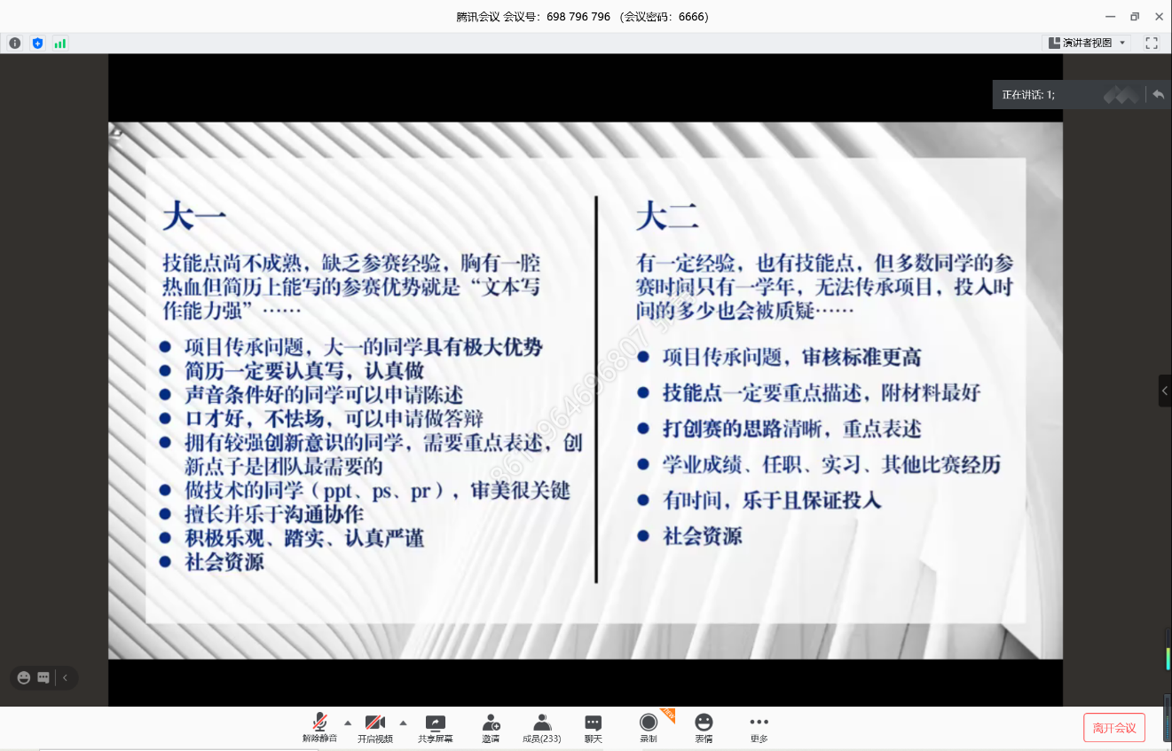接下来,第十二届山东省“挑战杯”大学生创业计划大赛金奖团队“废尽其用”项目负责人�海天从创赛经验与收获入手,重点就以三千计划为依托,引领项目成果向科创竞赛、学科竞赛和学业论文等方面进行转化进行了分享介绍。第六届山东财经大学建行杯“互联网+”大学生创新创业大赛银奖团队“匠轻蔬项目”负责人许有亮结合自己的实践经历,并结合其他优秀范例,向同学们介绍了“三千计划是什么”、“为什么参加”、“参加怎么做”以及“大学小白如何参加学科竞赛”等相关问题�