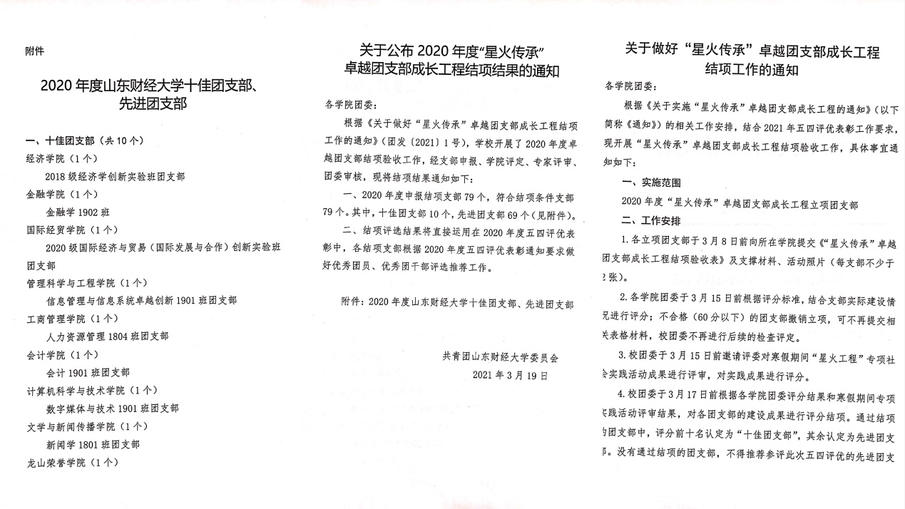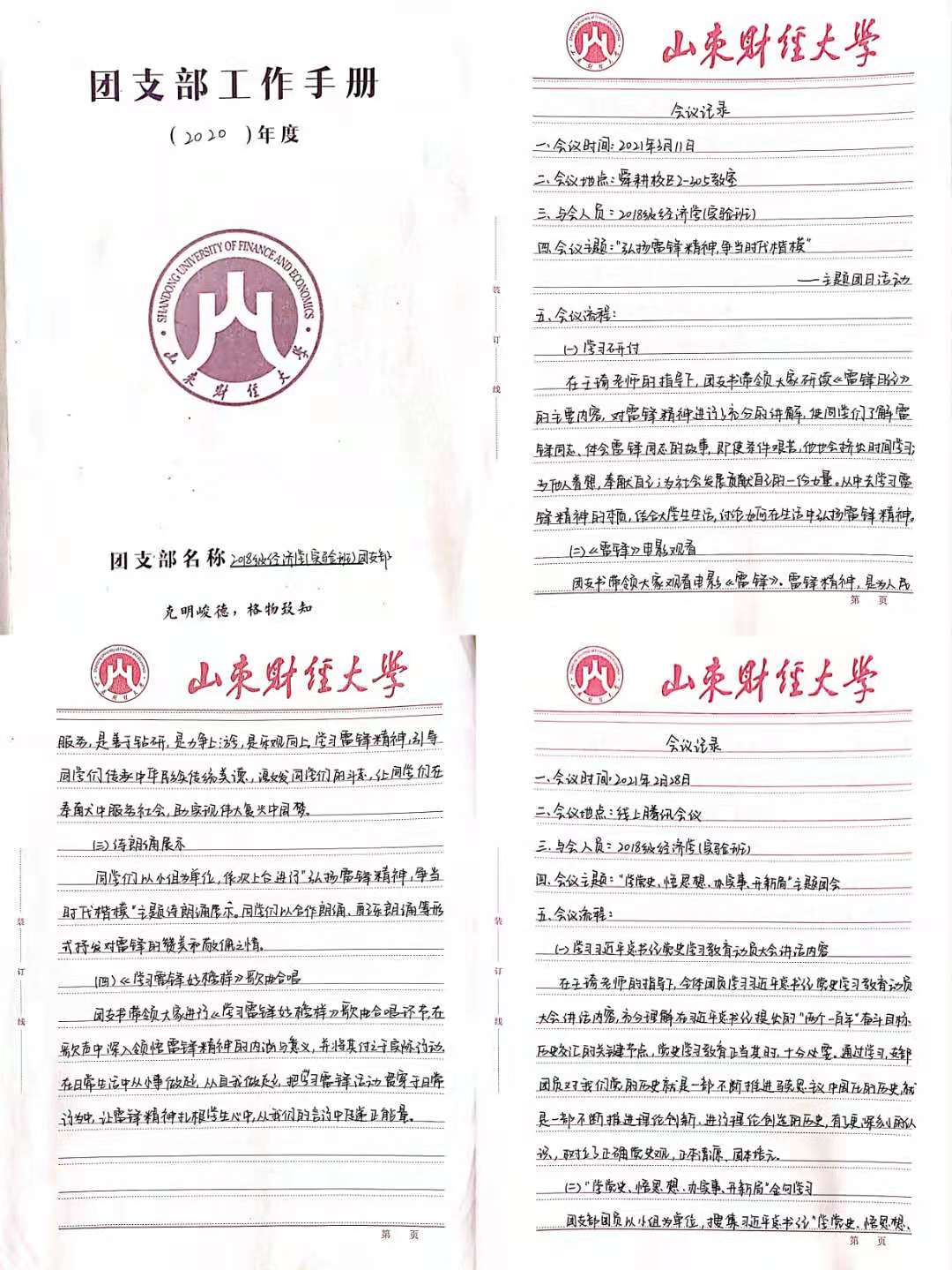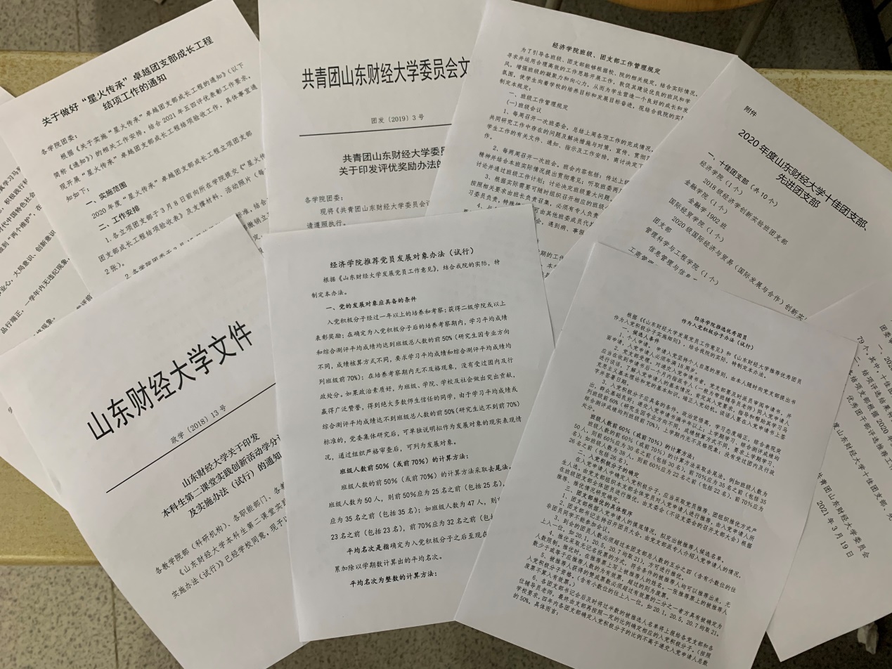 严格执行《中国共产主义青年团支部工作条例(试行)》、《共青团山东财经大学委员会评优奖励办法》、《山东财经大学关于印发本科生第二课堂实践创新活动学分认定及实施办法(试行)的通知》、《经济学院班委团支部换届选举办法�、《经济学院班级、团支部工作管理规定》、《经济学院推选优秀团员作为入党积极分子办法》、《经济学院党的发展对象的确定办法(试行)》等,落实“三会两制一课”制度,2020年召开7次团员大会�12次支委会�1次组织生活会�4次团课学习,提高团员思想理论水平和政治素质,引导团员在学习生活和本职岗位中发挥模范带头作用�