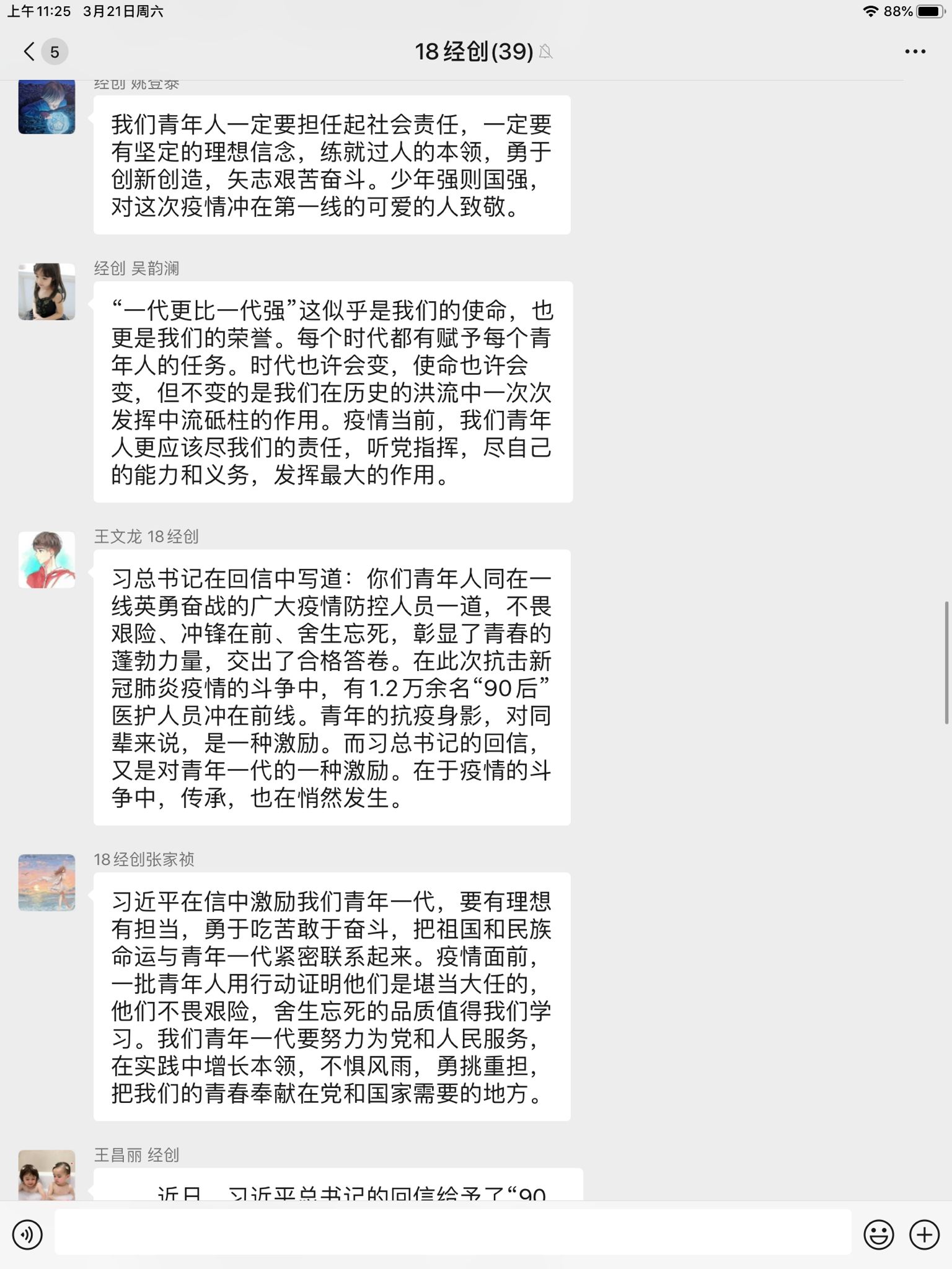 “青年兴则国家兴,青年强则国家强。青年一代有理想、有本领、有担当,国家就有前途,民族就有希望。� 山东财经大学经济学院2018�经济学创新实验班团支部将牢记习总书记对青年的嘱托和殷切希望,传承红�基�,筑牢理想信念,博学笃志,稳健致远,以奋斗精神铸就青春底色,砥砺前行,再创辉煌�