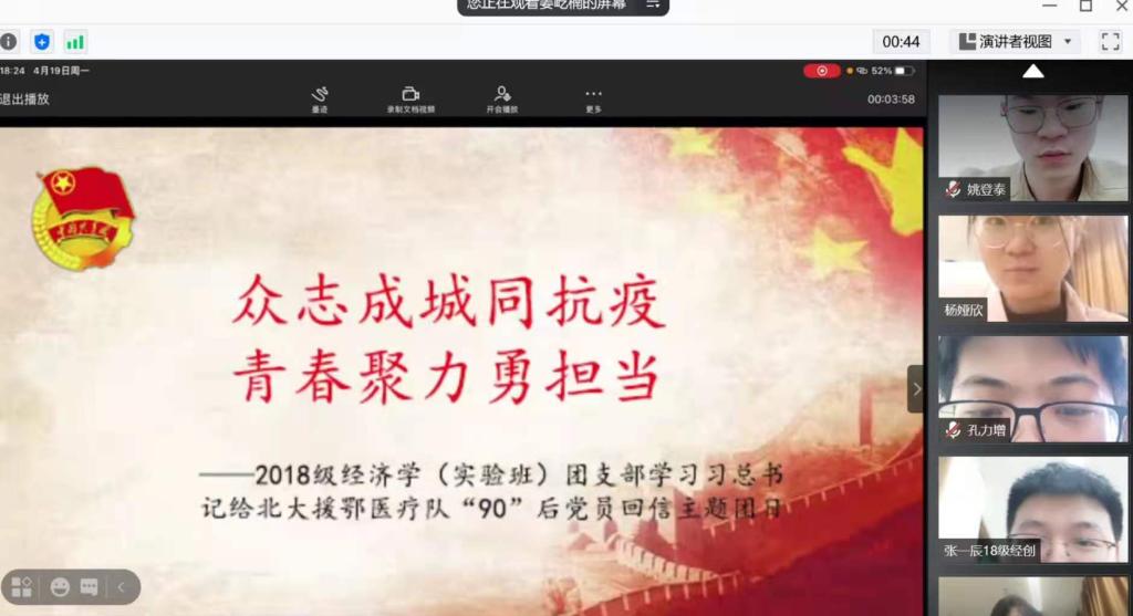 认真组织“青年大学习”,提升团员政治理论修养,每周参与率�100%,通过专题学习、分享交流、诗朗诵、合唱、情景剧等形式开展“众志成城同抗疫,青春聚力勇担当”学习习总书记给北大援鄂医疗队回信精神、“我为武汉加油,我为中国加油”、“�心聚力,积极向党组织靠拢”、学习团的十八大精神、“追寻红色记忆,传承红色精神”、“深入学习党史,牢记初心使命”专题学习、“学习十九届五中全会精神”、“弘扬雷锋精神,争当时代楷模”、“实践成长自我,助力乡村振兴”等主题团日活动�