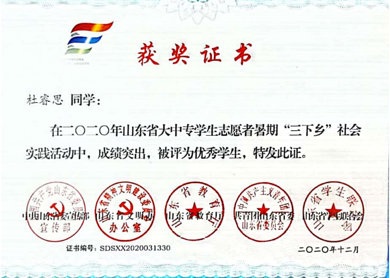 5人参加抗疫志愿服务,20余人参加“乡村振�齐鲁样板研究”调研服务队校级重大项目�8人参加“打造美丽宜居乡村,村庄景区化公益行”校级重大项目,杜睿思获省级社会实践优秀学,为助力脱贫攻坚、乡村振兴贡献力量�